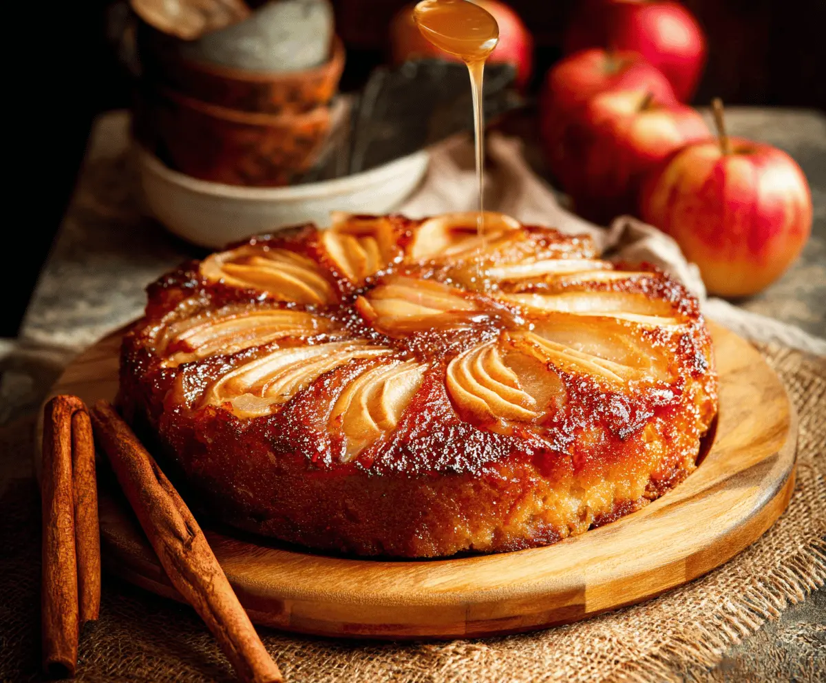 Delicious homemade apple upside down cake topped with caramelized apple slices and a golden cake layer, perfect for dessert or special occasions.