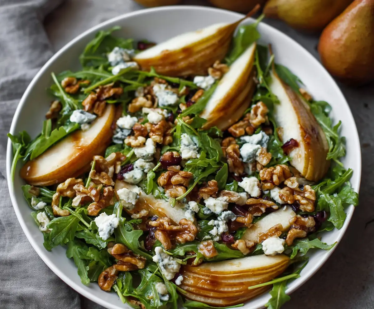 Enjoy this vibrant salad that perfectly combines the pepperiness of arugula with sweet pears, crunchy walnuts, and creamy blue cheese!