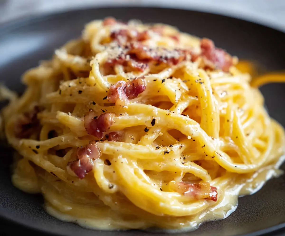 Delicious homemade Pasta Carbonara with creamy sauce and crispy pancetta ready to serve.
