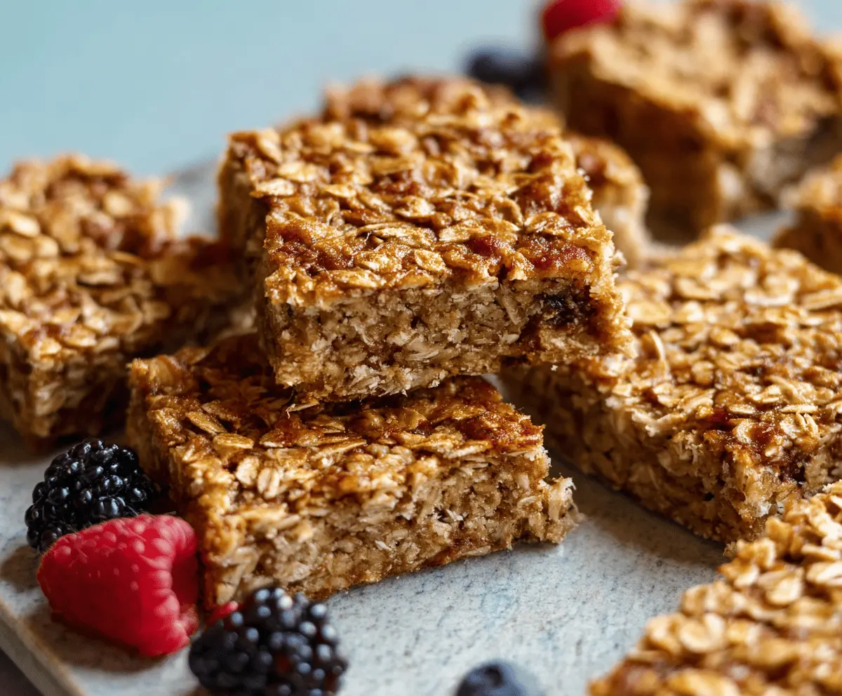 These bars have a moist and chewy texture with a lightly golden top, showcasing their hearty oat goodness. The addition of fresh blueberries perfectly complements this healthy treat!