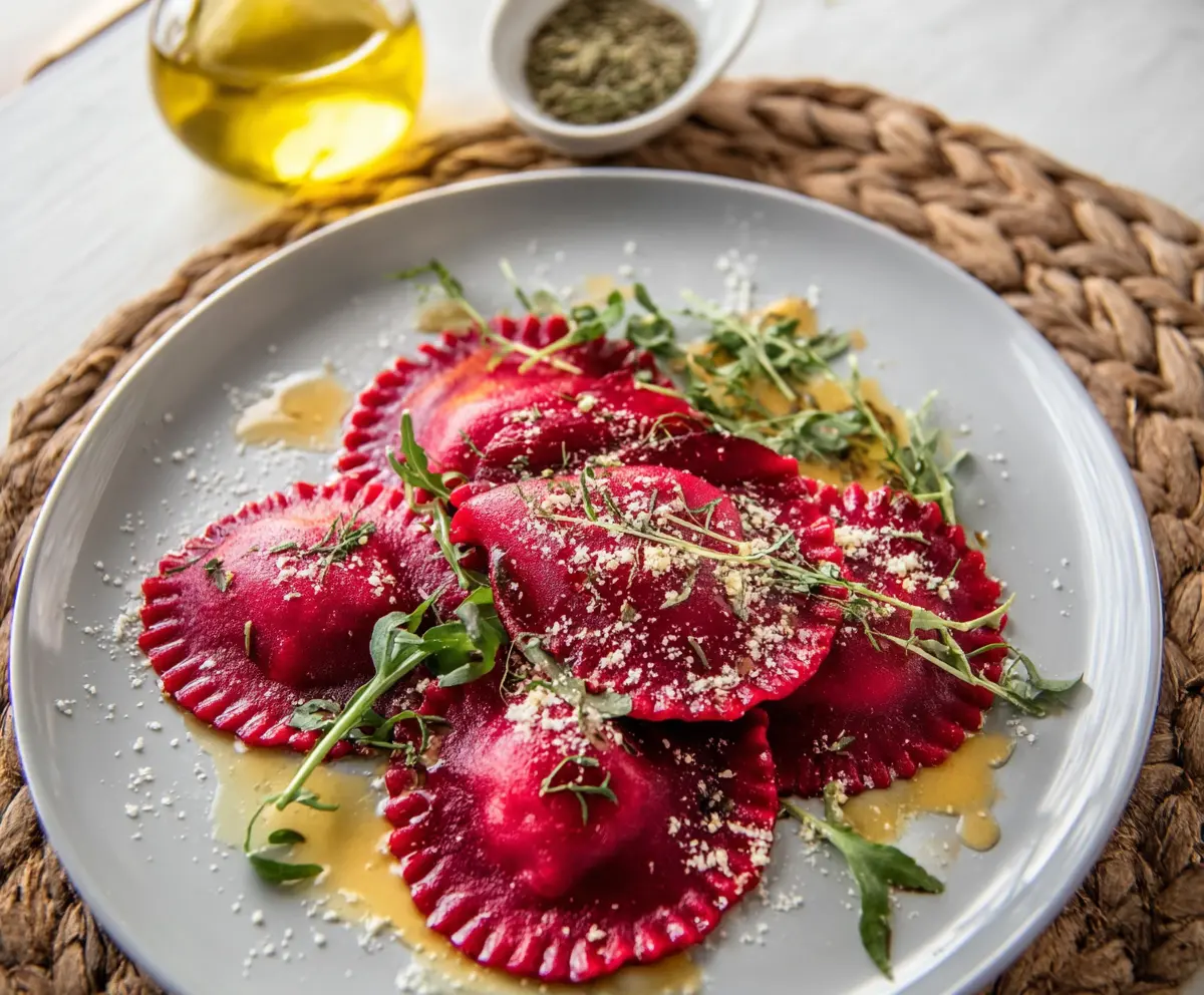 Beet ravioli is a colorful twist on a classic dish! Made with fresh beets, it has a sweet and earthy flavor that makes every bite special. The bright color is simply stunning!