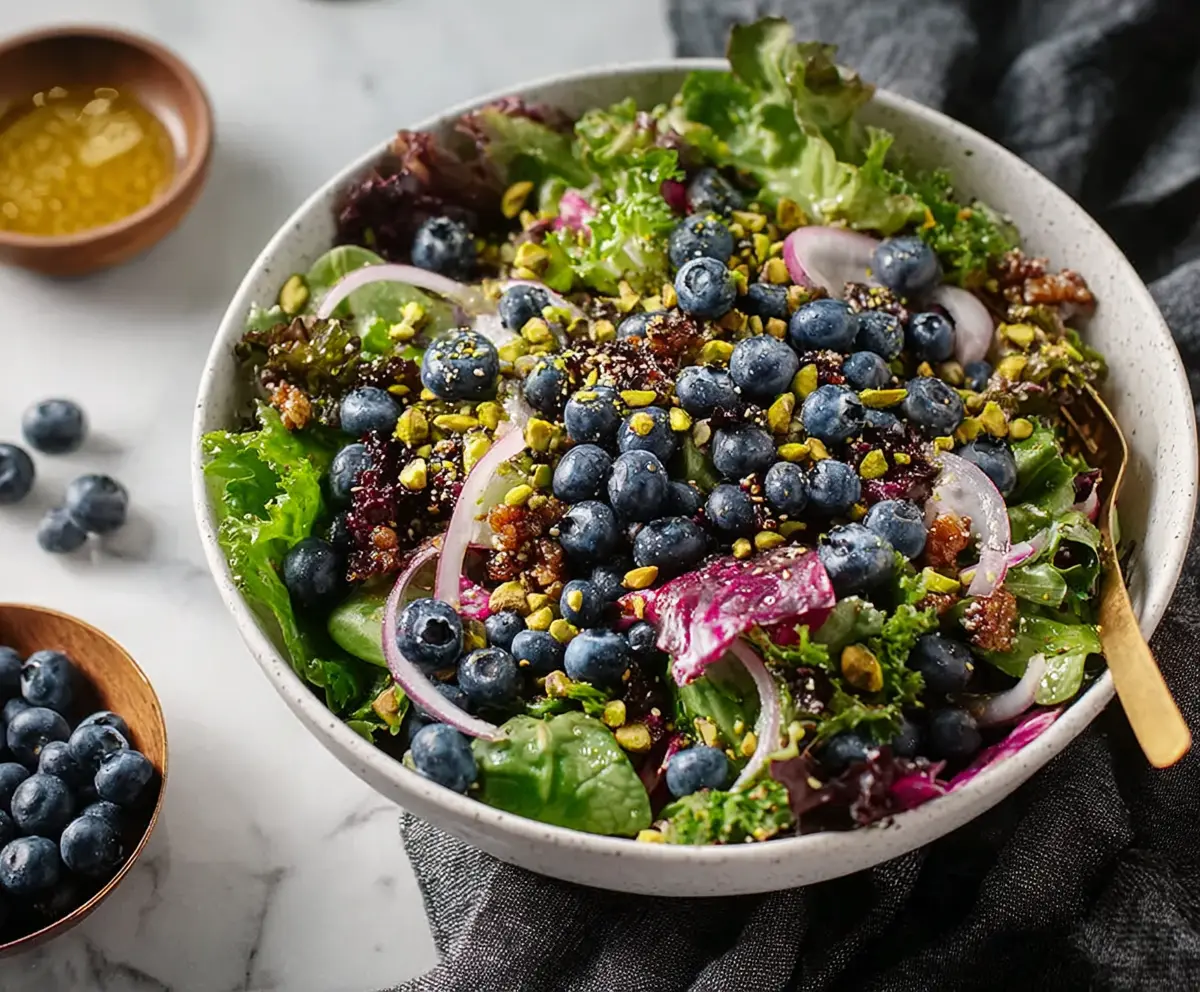 This Blueberry Pistachio Crunch Salad is a perfect mix of flavors and textures. Sweet blueberries, crunchy pistachios, and fresh greens come together for a colorful treat!