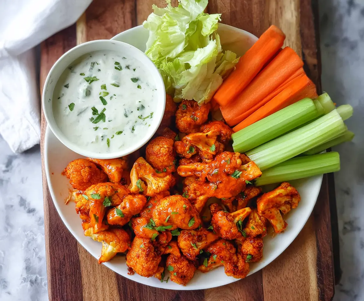 Once done baking, transfer your buffalo cauliflower bites to a serving platter. Sprinkle with chopped parsley for a fresh touch. Serve immediately with celery sticks, carrot sticks, and your choice of ranch or blue cheese dressing for dipping.