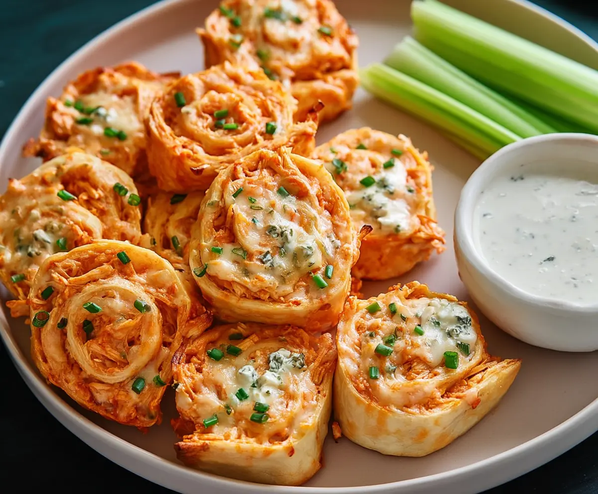 Arrange the pinwheels on a serving platter and sprinkle with chopped fresh chives for a nice touch. Serve alongside celery sticks and a side of ranch or blue cheese dressing for dipping. Enjoy your spicy, creamy, and crispy Buffalo Chicken Ranch Pinwheels!