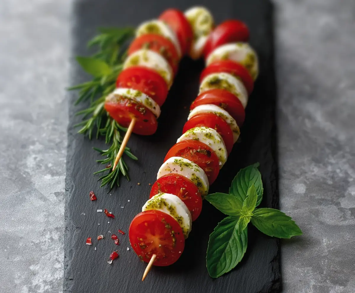 Lightly sprinkle your skewers with salt and freshly ground black pepper for a touch of seasoning. If you’d like, drizzle a bit of balsamic glaze over the skewers for an extra layer of flavor and a lovely presentation.