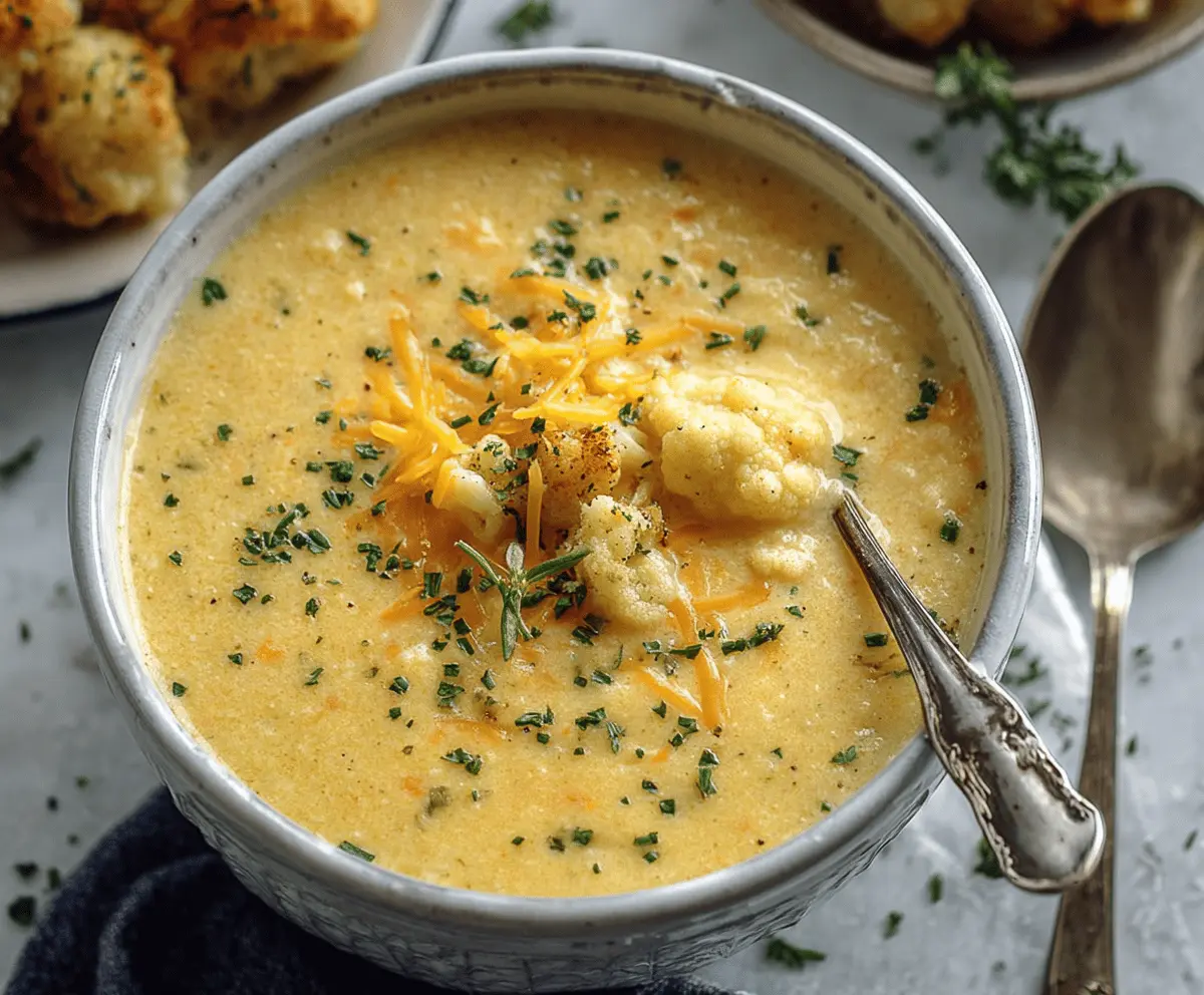If you want, sauté or roast some cauliflower florets with a little olive oil until lightly browned for garnish. Now ladle the soup into bowls, top with the roasted florets, extra shredded cheddar, and a sprinkle of fresh parsley or chives for color.