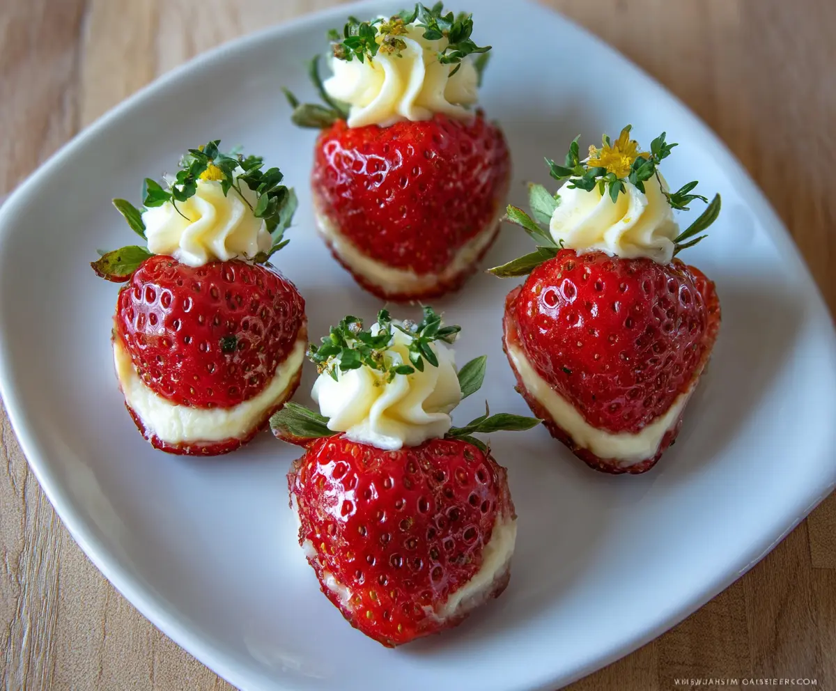 Delicious Cheesecake Deviled Strawberries garnished with fresh herbs for a sweet appetizer.