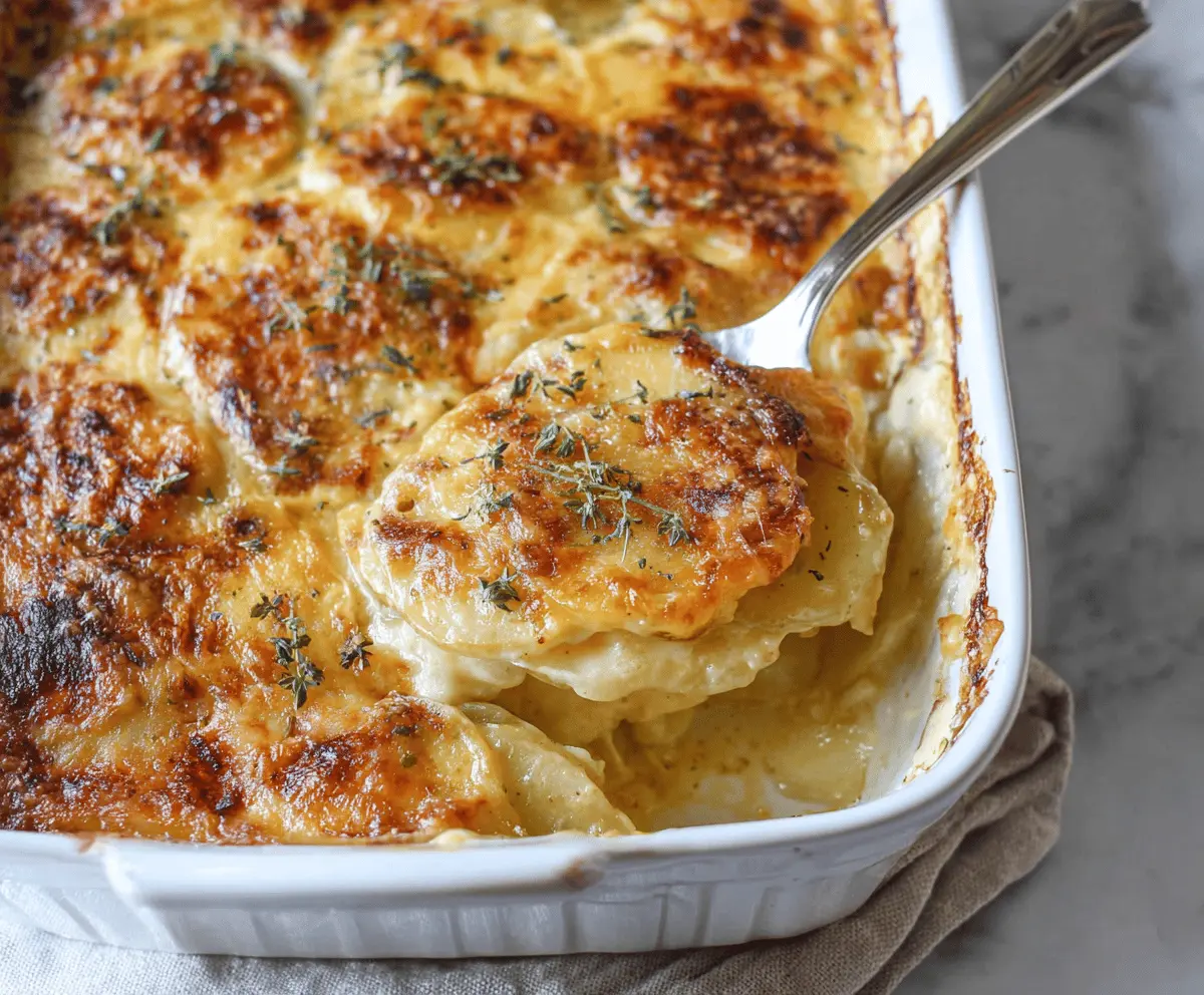 Once done, let the scalloped potatoes rest for about 10 minutes to thicken up a little. When ready to serve, garnish with fresh thyme sprigs for a lovely touch!