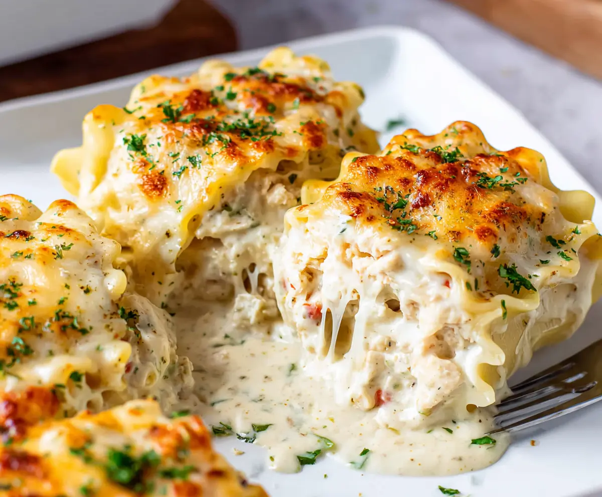 Delicious Chicken Alfredo Lasagna Rolls with creamy sauce and melted cheese