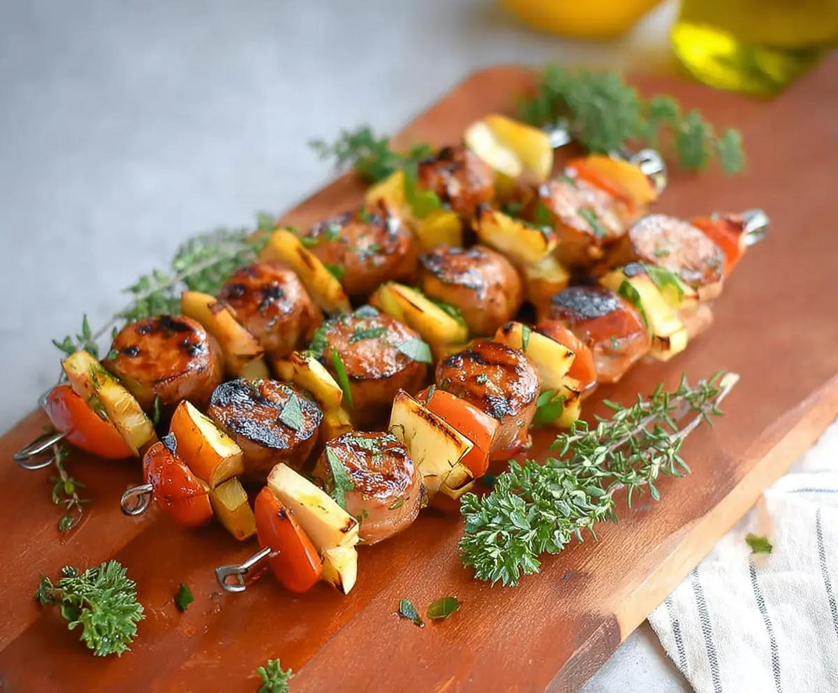 Grilled chicken apple sausage skewers with fresh herbs and colorful vegetables