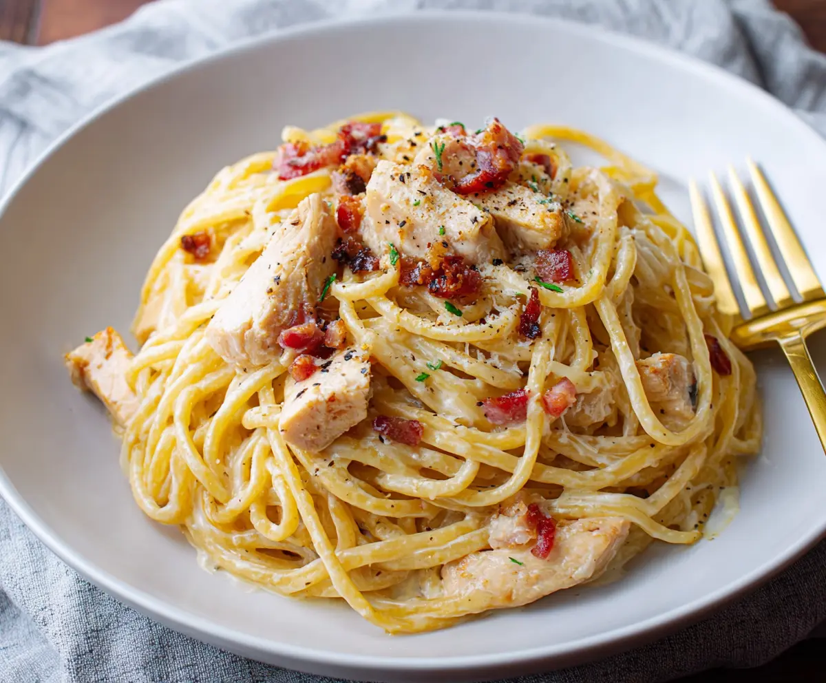 This Chicken Carbonara Pasta is creamy, cheesy, and oh-so-satisfying! Tender chicken, crispy bacon, and a rich sauce make it a comforting meal that everyone loves.