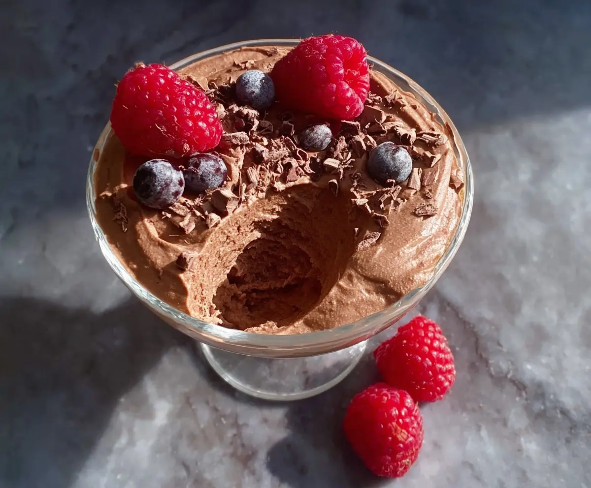 Once chilled, remove the mousse from the fridge. Just before serving, top it off with fresh raspberries and blueberries for a pop of color and flavor. If you like, sprinkle some grated dark chocolate or cacao nibs on top for an extra treat!