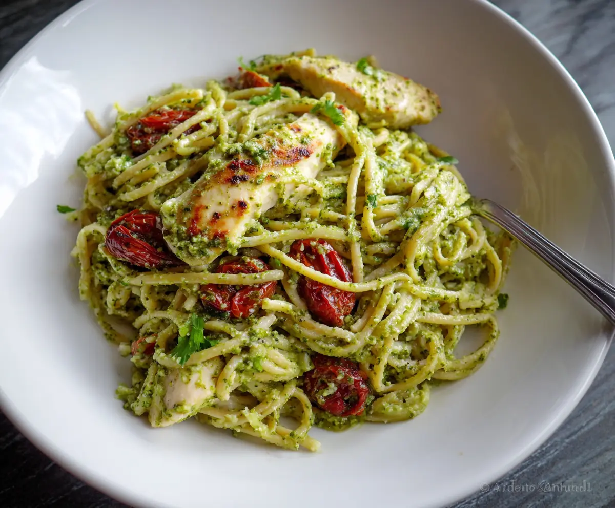 This delightful dish takes about 30 minutes to prepare. You’ll spend around 10-15 minutes cooking the pasta and chicken, and another 10-15 minutes making the fresh pesto and tossing everything together. It’s a quick and flavorful meal for any day of the week!