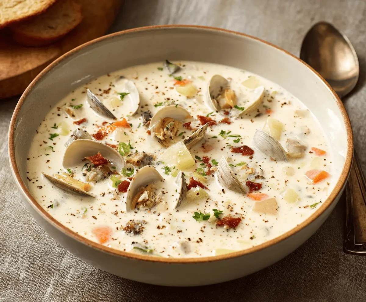 This creamy clam chowder is warm and cozy, perfect for chilly days. Packed with tender clams, potatoes, and a hint of savory bacon, it’s comfort in a bowl!