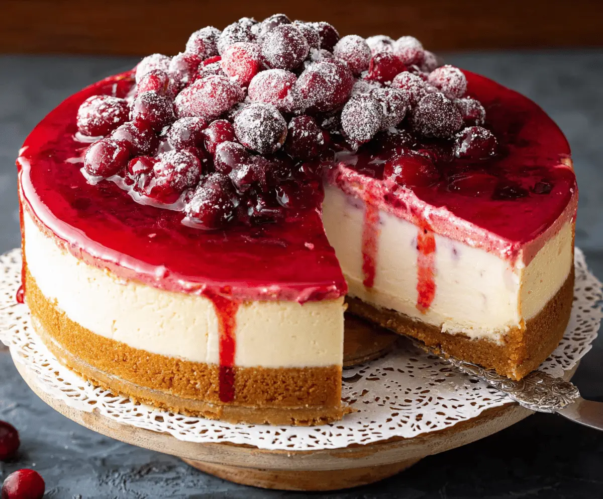 Once the cheesecake is fully chilled, spread the cranberry topping evenly over the surface. If you like, garnish with fresh cranberries placed in the center and dust with powdered sugar for a festive touch.