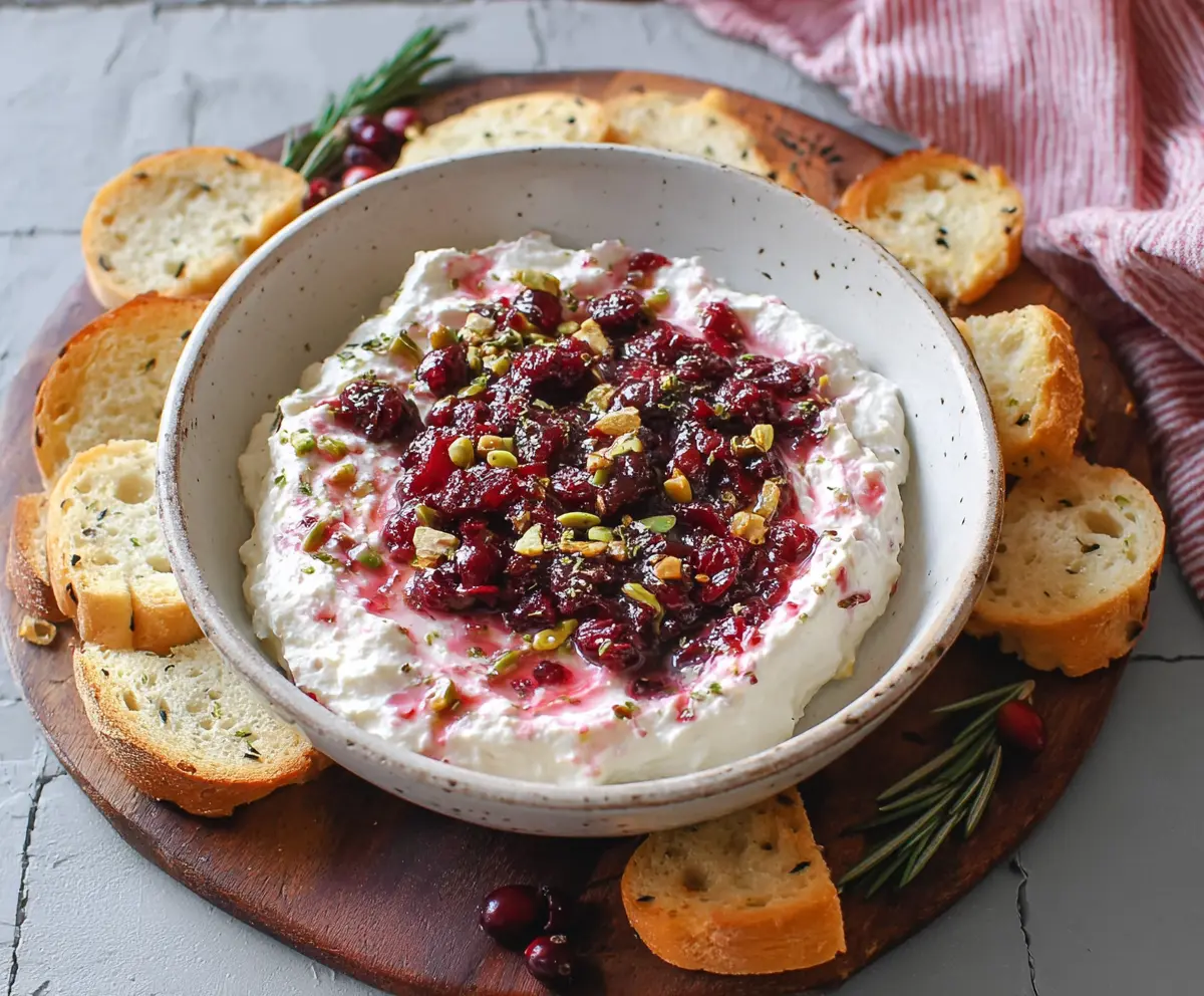 Place the bowl on a serving board surrounded by crostini or crackers for dipping. Enjoy this festive, creamy, tangy, and slightly sweet dip that’s perfect for holiday parties or any occasion!