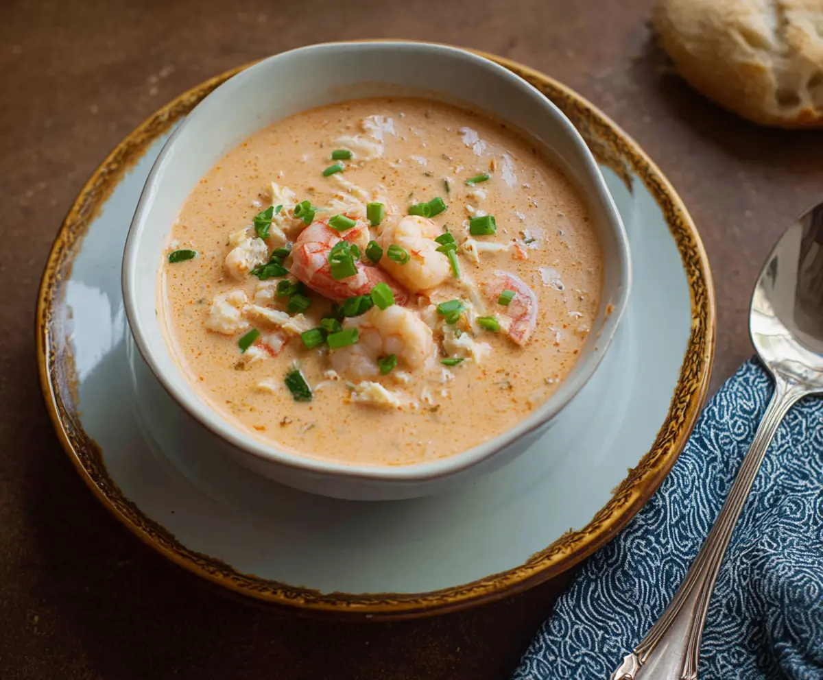 Creamy crab and shrimp seafood bisque in a bowl, garnished with herbs.