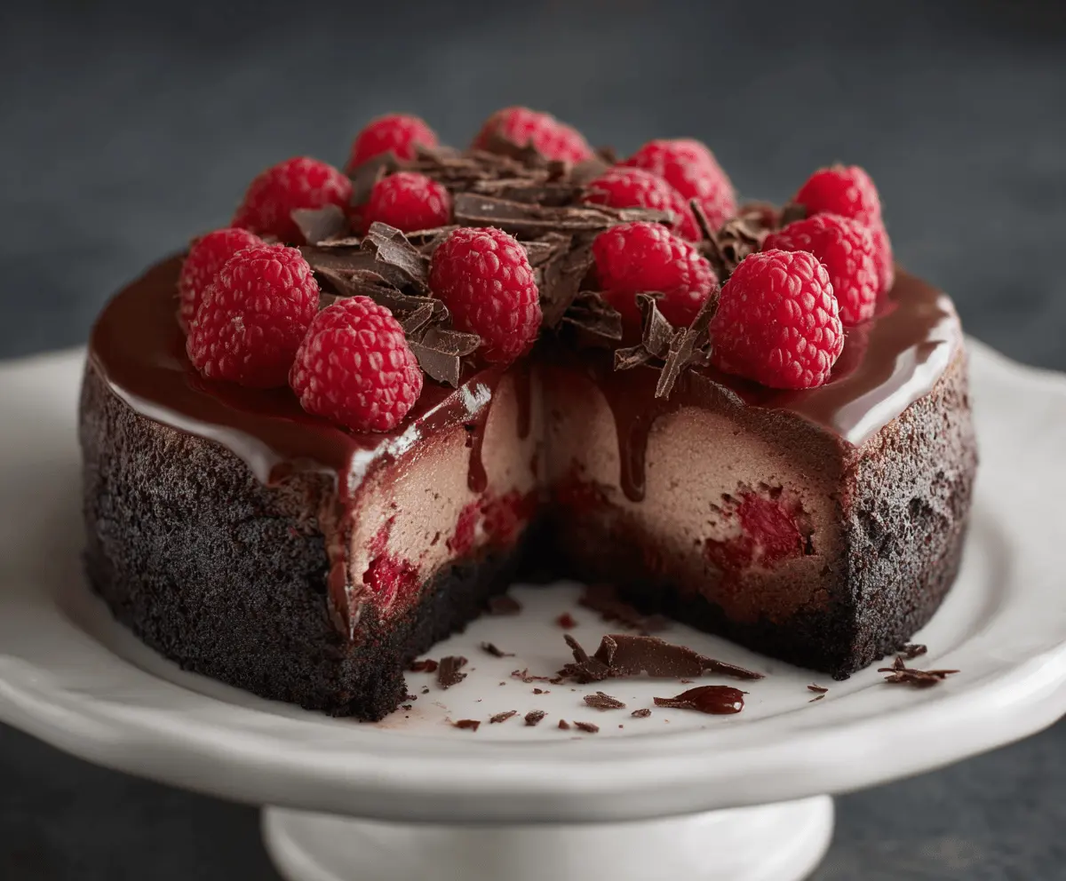 Decadent dark chocolate raspberry cheesecake with rich cocoa and fresh raspberries on top.