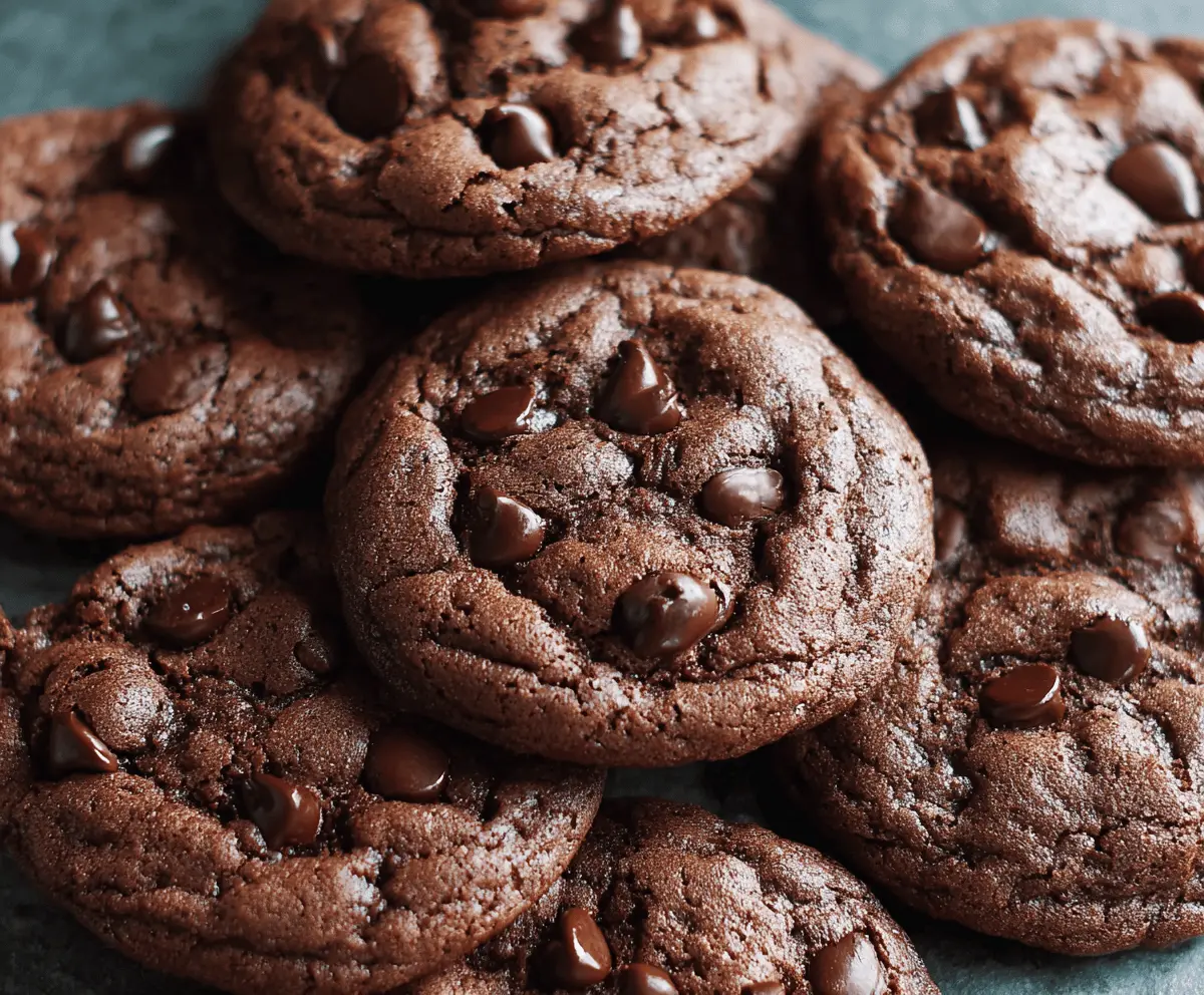 Delicious homemade double chocolate chip cookies with gooey chocolate chunks.