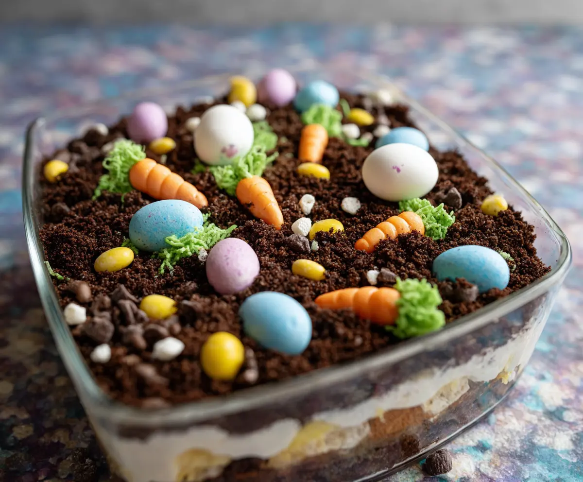 This fun Easter Dirt Cake is a sweet treat that looks like a cute little garden! Made with layers of chocolate pudding, crushed cookies, and gummy worms, it’s a delight for kids and adults alike.