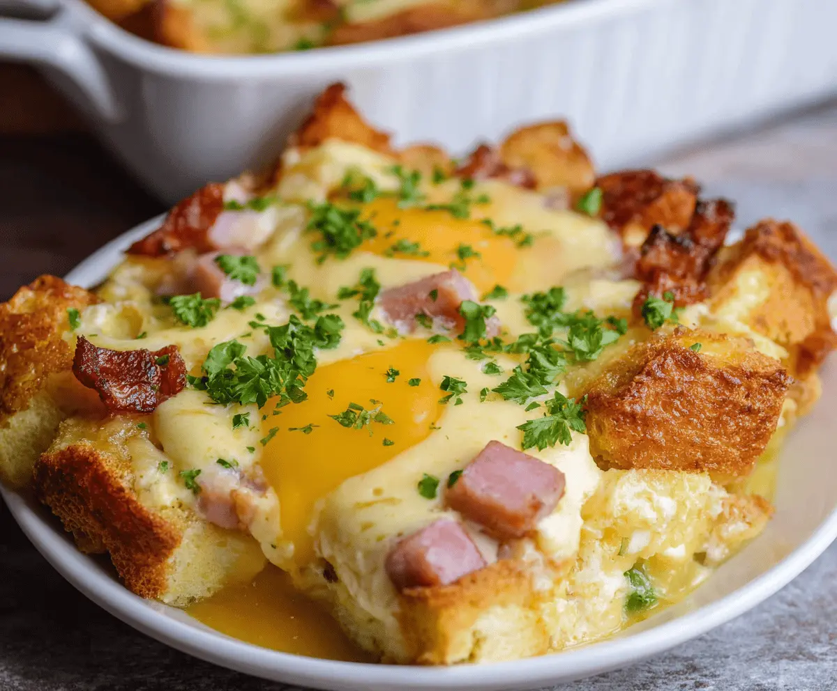 Delicious Eggs Benedict Casserole with poached eggs, hollandaise sauce, and breakfast ham on a baking dish.