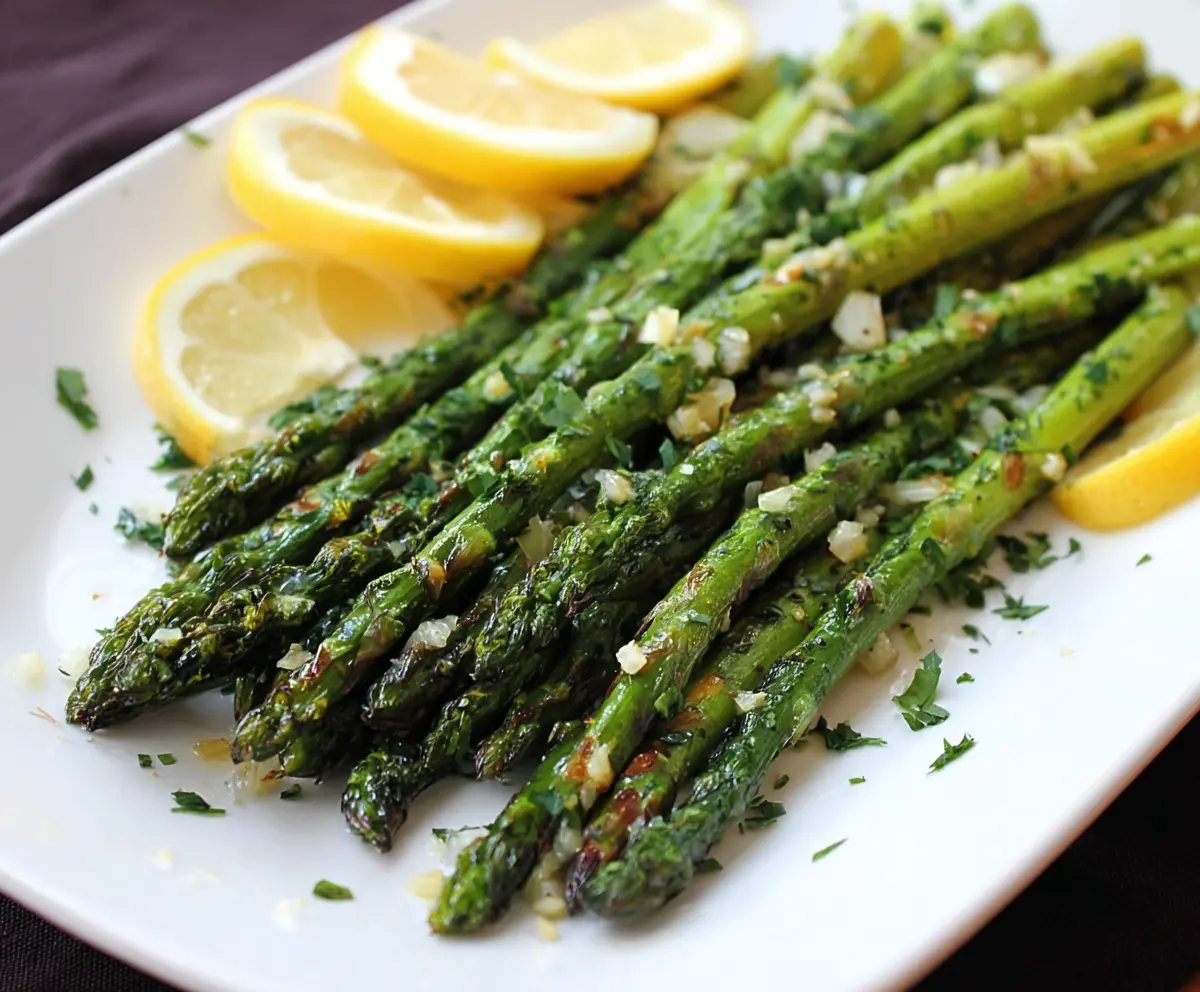 Delicious garlic herb roasted asparagus on a serving plate, perfect for healthy side dishes.