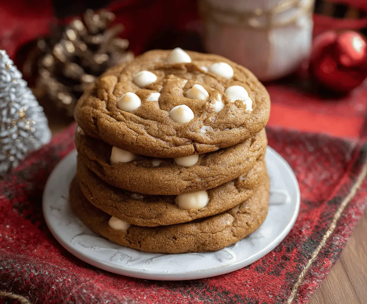 Delicious gingerbread white chocolate chip cookies fresh from the oven, showcasing crispy edges and chewy centers.