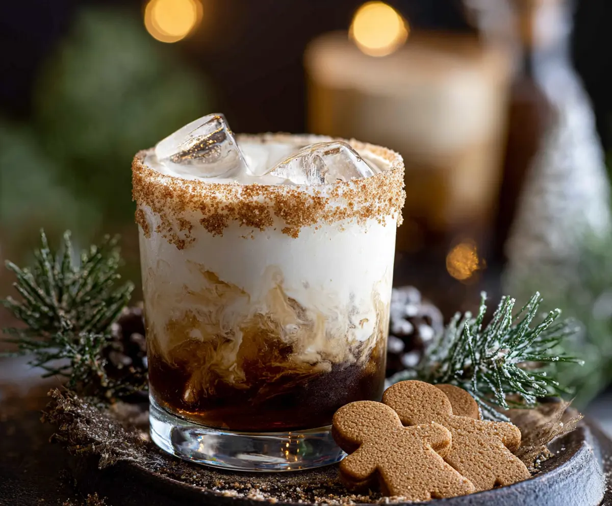 Enjoy your Gingerbread White Russian, a creamy cocktail with warm holiday spice and a cozy, sweet flavor!