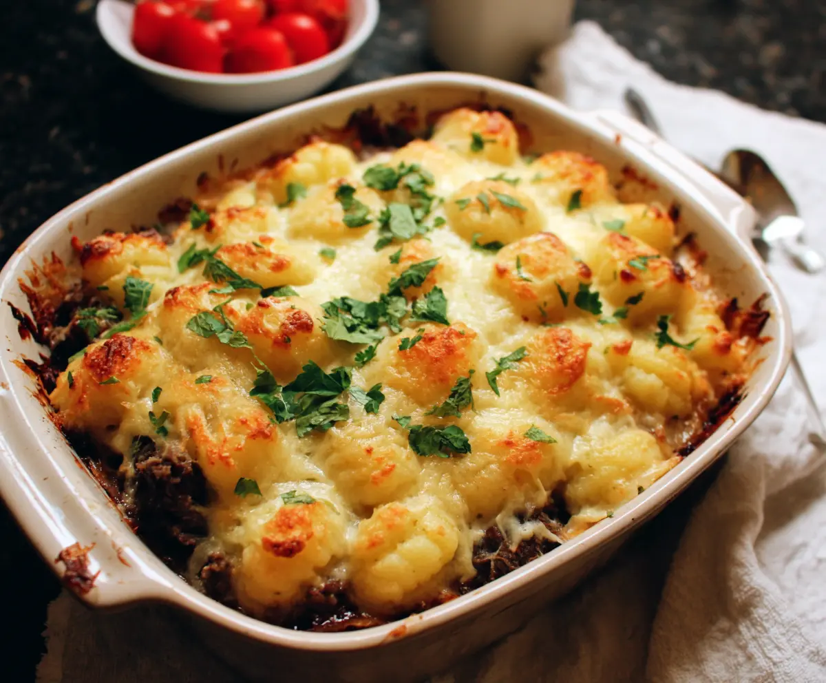Delicious Gnocchi Shepherd's Pie featuring golden baked gnocchi topped with savory mutton and vegetables.