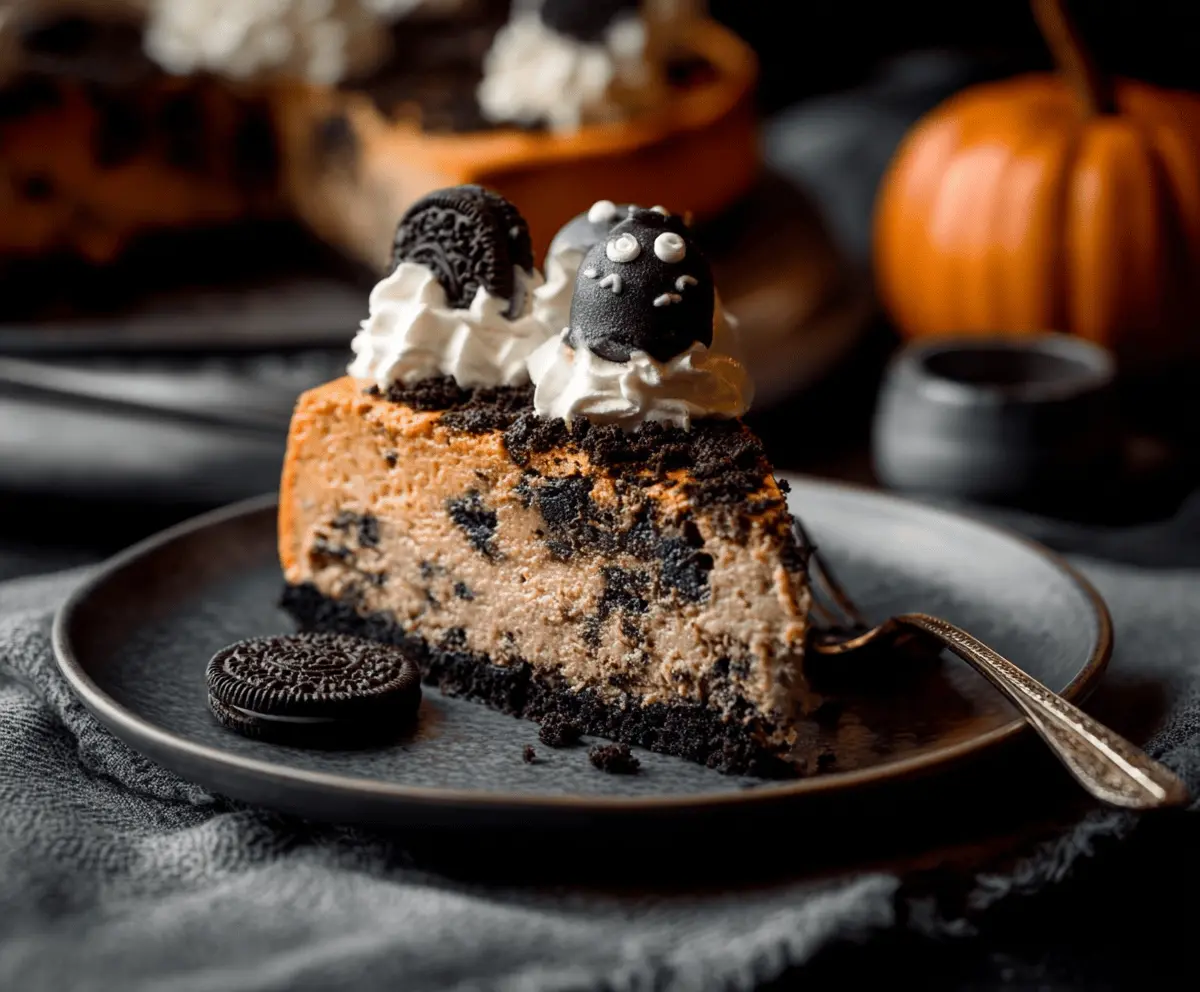 This Halloween Cookies and Cream Cheesecake is both spooky and delicious! It has a creamy filling packed with crushed cookies and a rich chocolate crust, perfect for celebrating the season.