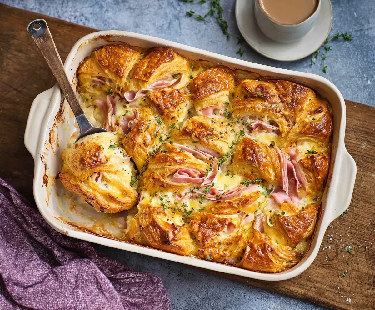 Delicious ham and cheese croissant brunch bake with golden crust and melty cheese