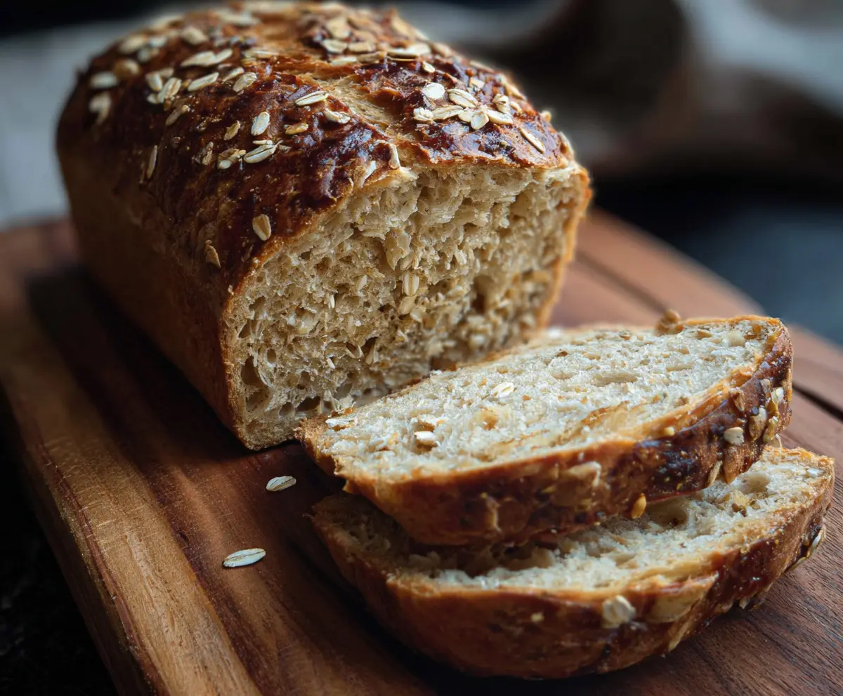 Freshly baked honey oat sourdough sandwich bread sliced and ready to serve.