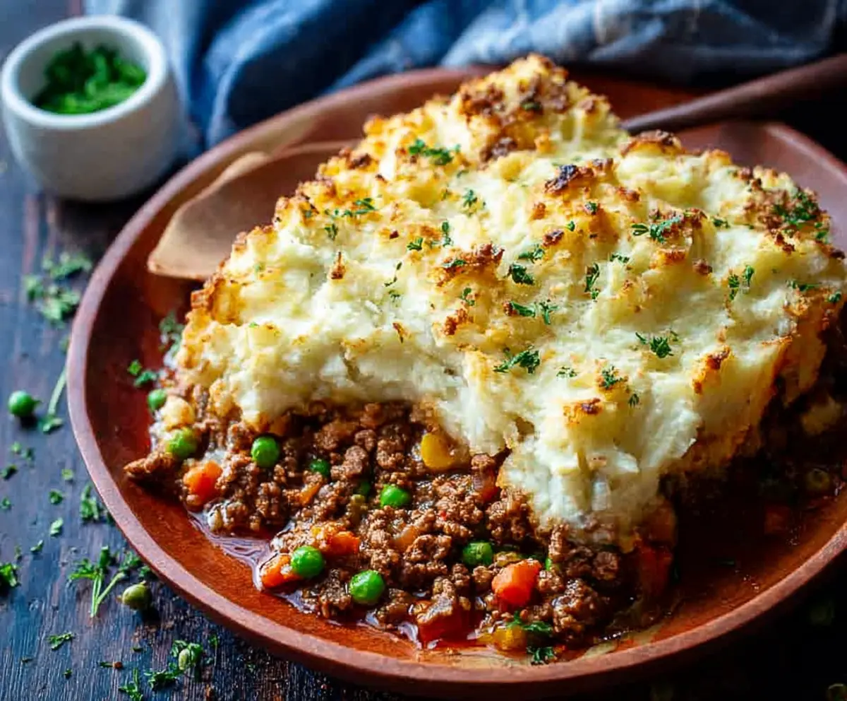 After baking, remove the Shepherd’s Pie from the oven and let it rest for about 5 minutes before serving. Garnish with fresh chopped parsley or chives to add a pop of color and flavor. Serve warm and enjoy your hearty meal!