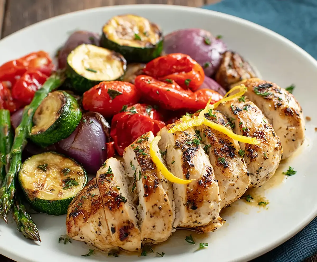 Delicious Lemon Herb Chicken served with roasted vegetables on a plate.