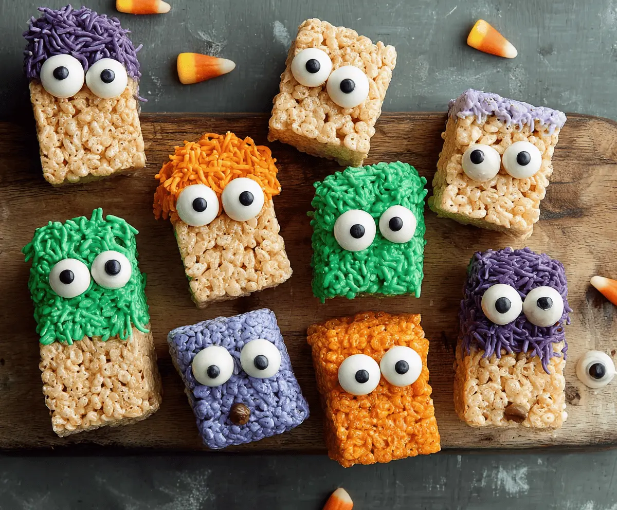 Colorful Monster Rice Krispie Treats with vibrant frosting and candy decorations, perfect for kids' parties and celebrations