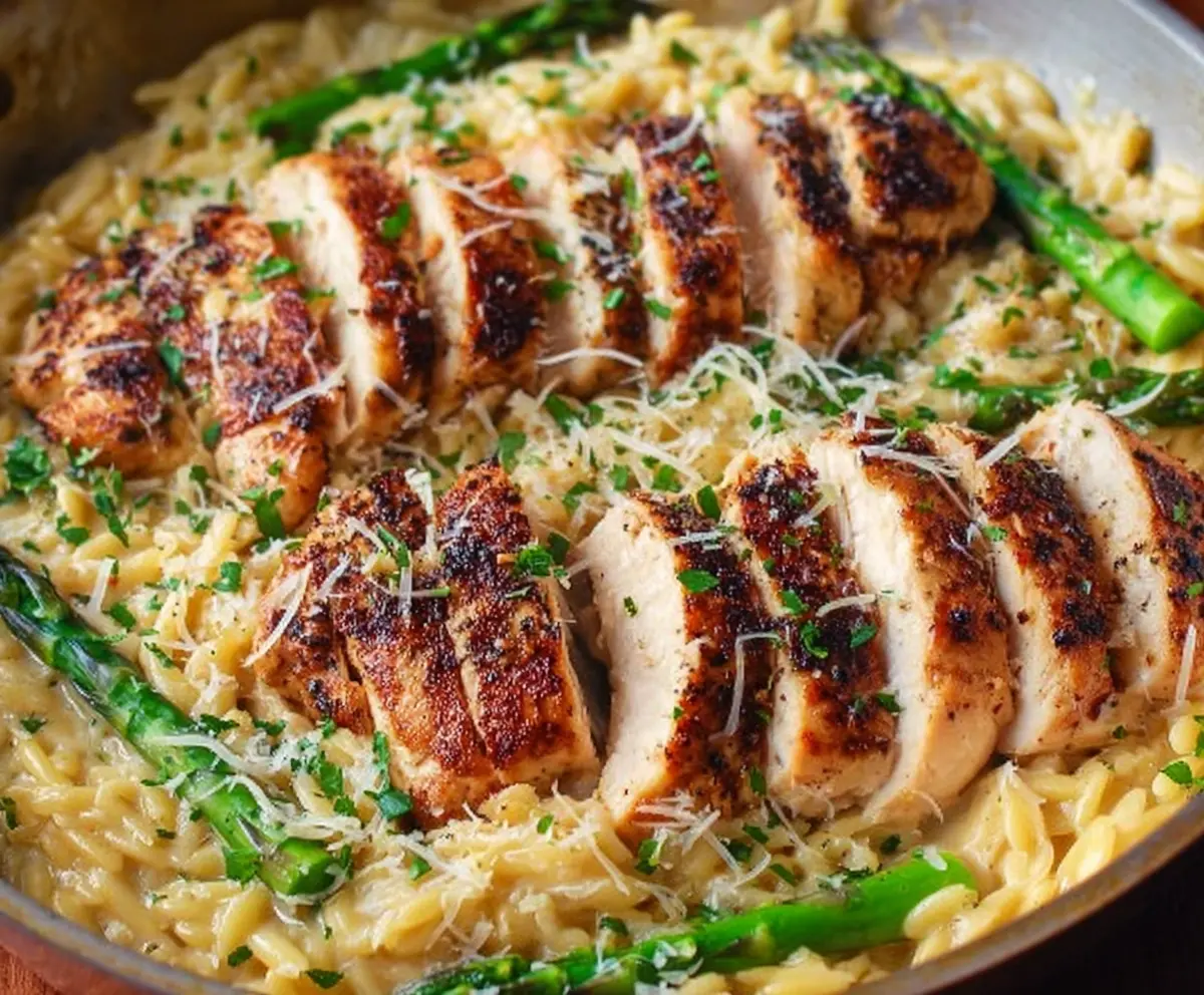 Creamy Parmesan orzo with grilled chicken and fresh asparagus on a plate