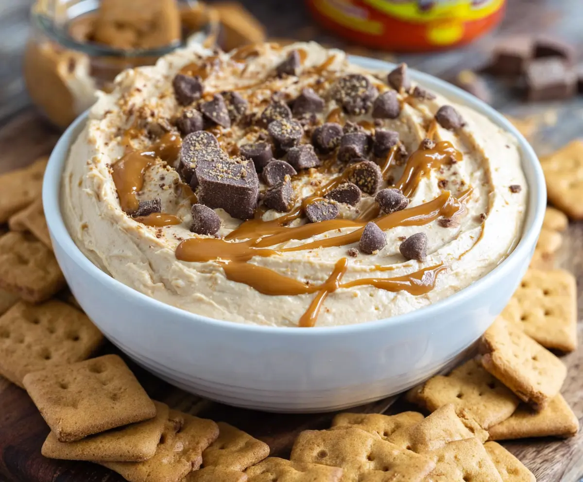Sprinkle some mini chocolate chips and peanut butter cup pieces over the top of your dip. This adds a fun touch and makes it even more delicious!