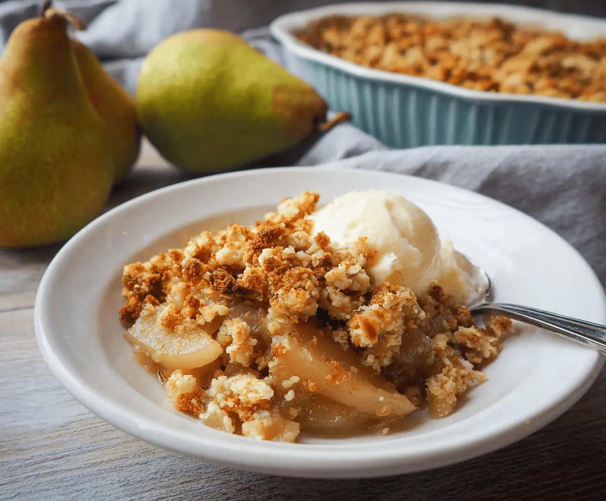 I love how easy it is to throw together! Just mix the pears with a touch of sugar, toss on that crispy topping, and bake. It’s a hug in a dish! Serve it with ice cream for extra joy!