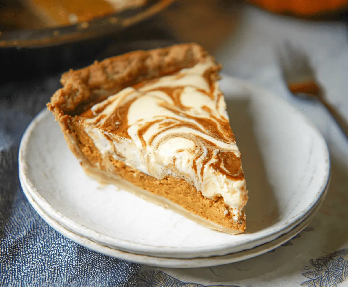This Pumpkin Cheesecake Swirl Pie combines two favorites into one tasty dessert! The creamy pumpkin filling hugs a rich cheesecake layer, all sitting in a buttery crust.