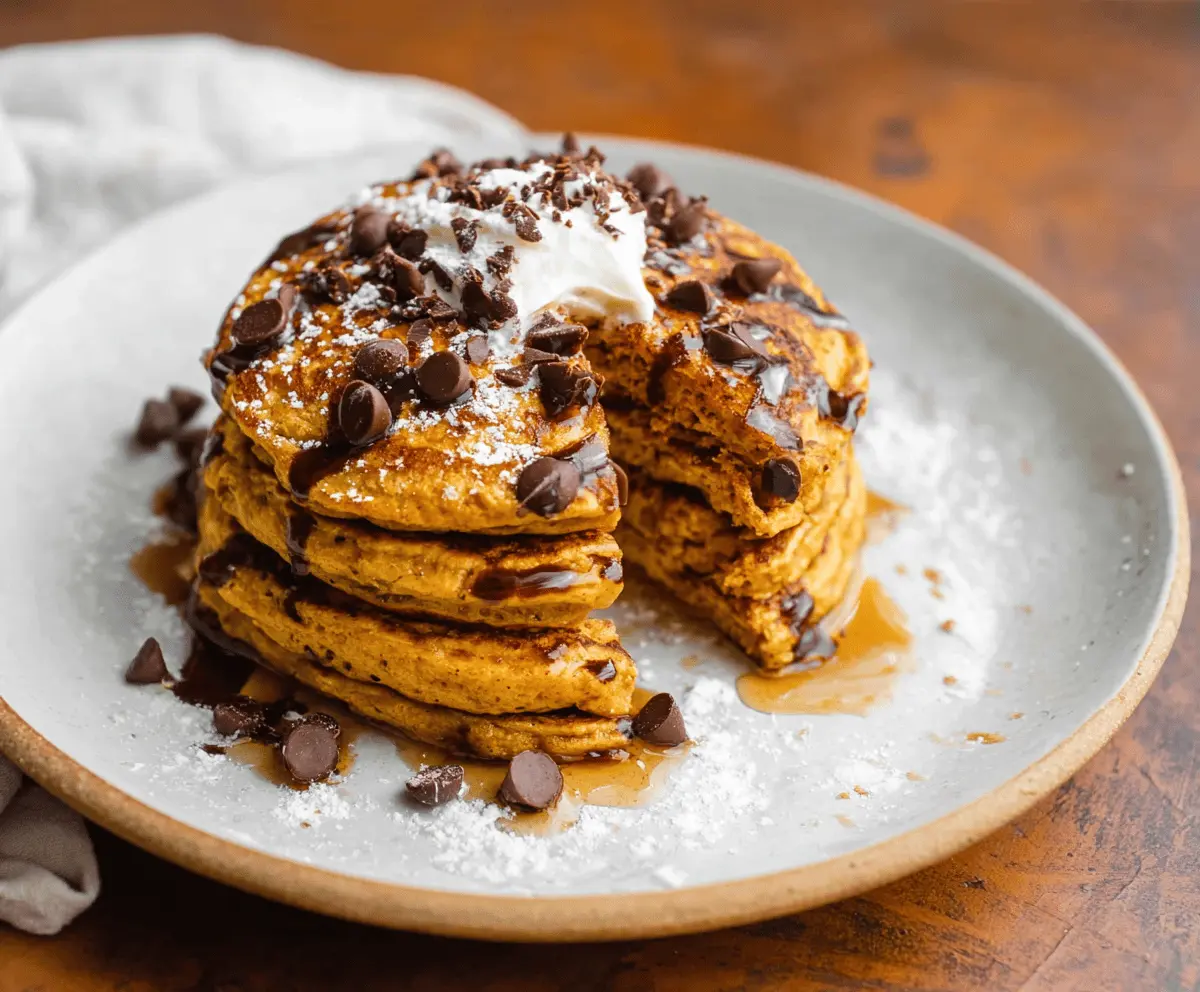 These fluffy pumpkin chocolate chip pancakes are perfect for a cozy breakfast! With warm spices and sweet chocolate chips, they bring a touch of fall to your table.