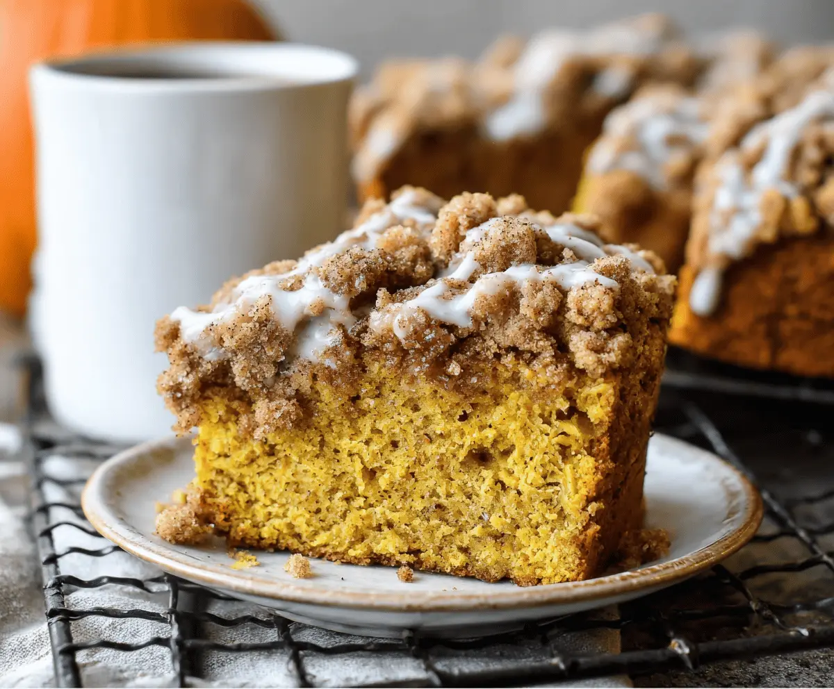 Drizzle the glaze over the warm cake, let it soak in just a bit, then cut it into squares. Enjoy your delightful pumpkin coffee cake with a hot cup of coffee or tea—perfect for any time of day!