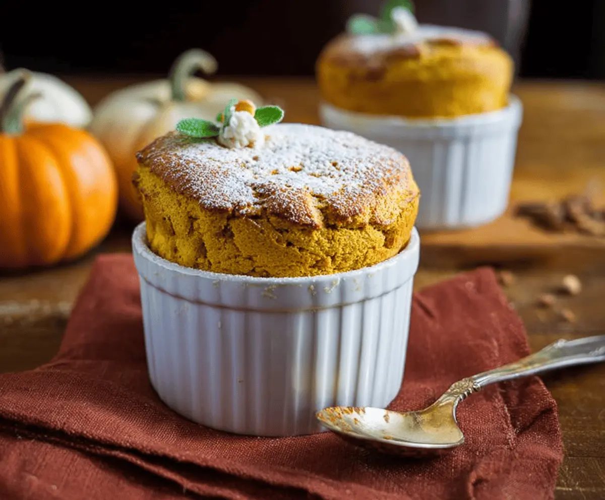 Delicious fluffy pumpkin soufflé topped with powdered sugar, served in a white ramekin on a rustic wooden table, perfect for fall desserts
