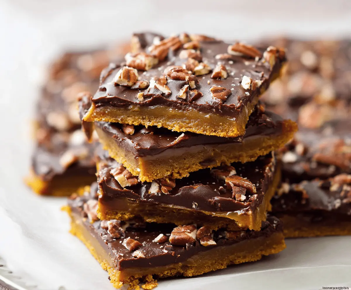 Sprinkle the toffee bits and, if you’re using them, the chopped pecans on top of the chocolate layer. Gently press them in so they stick!