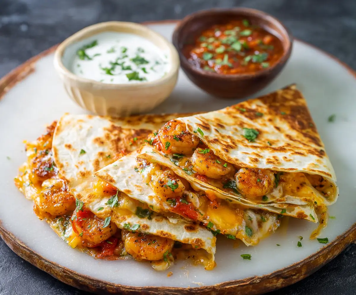 Delicious shrimp quesadilla sliced in half showing melted cheese and shrimp filling on a wooden plate.