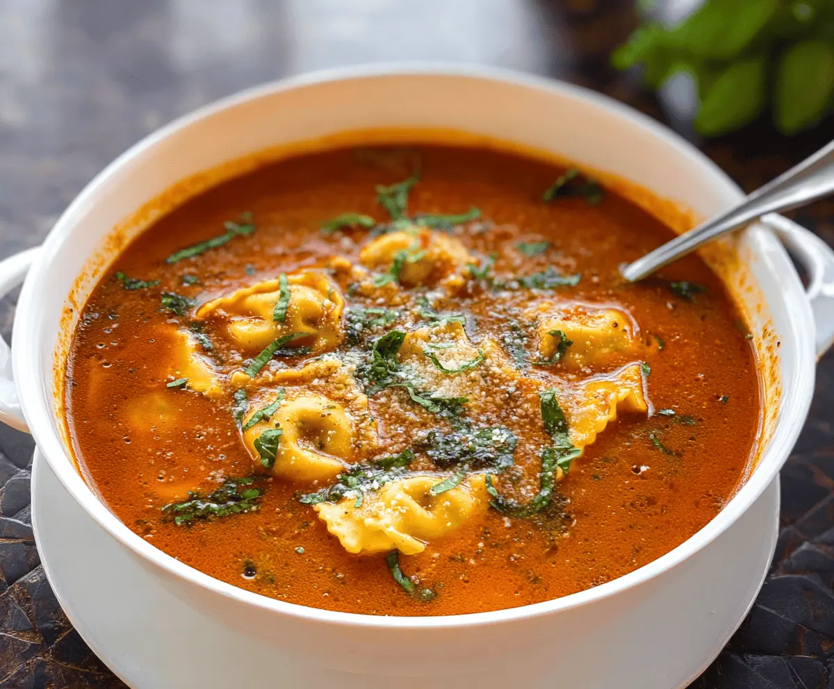 A bowl of warm ravioli soup garnished with fresh herbs, showcasing tender ravioli pasta in a flavorful broth, perfect for a comforting meal.