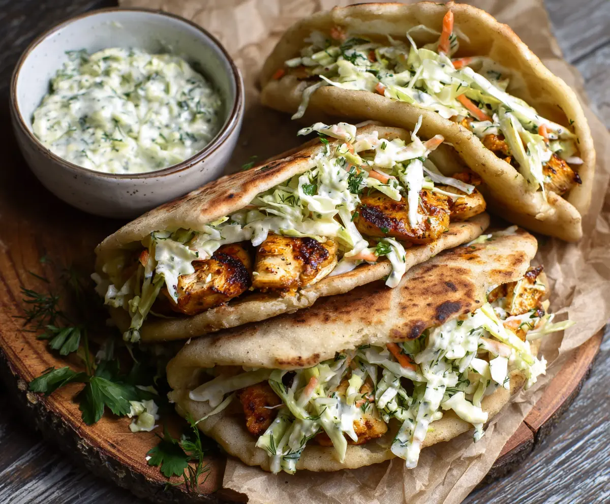 Once everything is ready, it’s time to assemble! Open each pita pocket and add a layer of the sliced chicken inside. Top it off with a generous amount of the fresh herb ranch slaw.