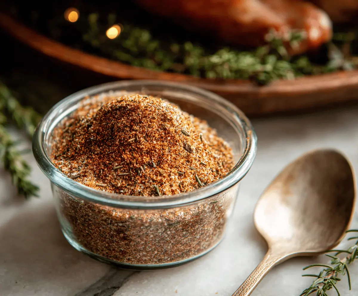 Close-up of a bowl with a simple turkey rub seasoning mix for grilling or roasting.