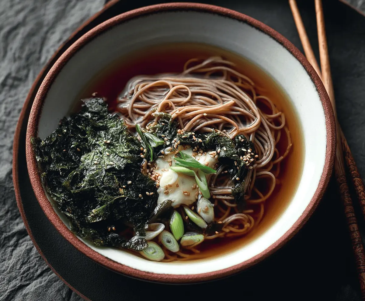 Divide the cooked soba noodles into serving bowls. Then, pour the hot broth with mushrooms and seaweed over the noodles. The warmth will brighten everything up!