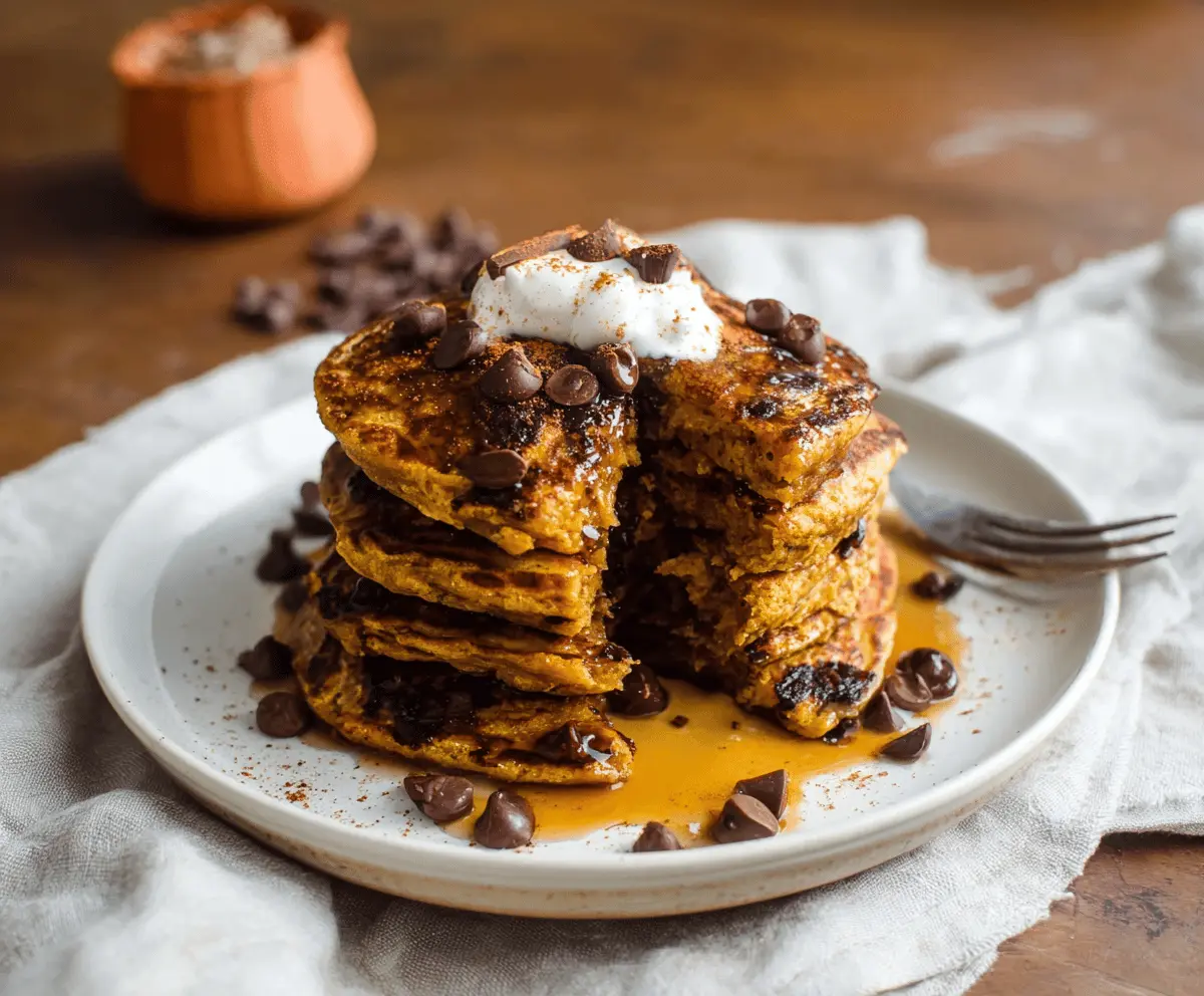 Get ready for a warm and cozy breakfast with these spiced pumpkin chocolate chip pancakes! They are fluffy and sweet, bursting with pumpkin flavor and little chocolatey surprises.