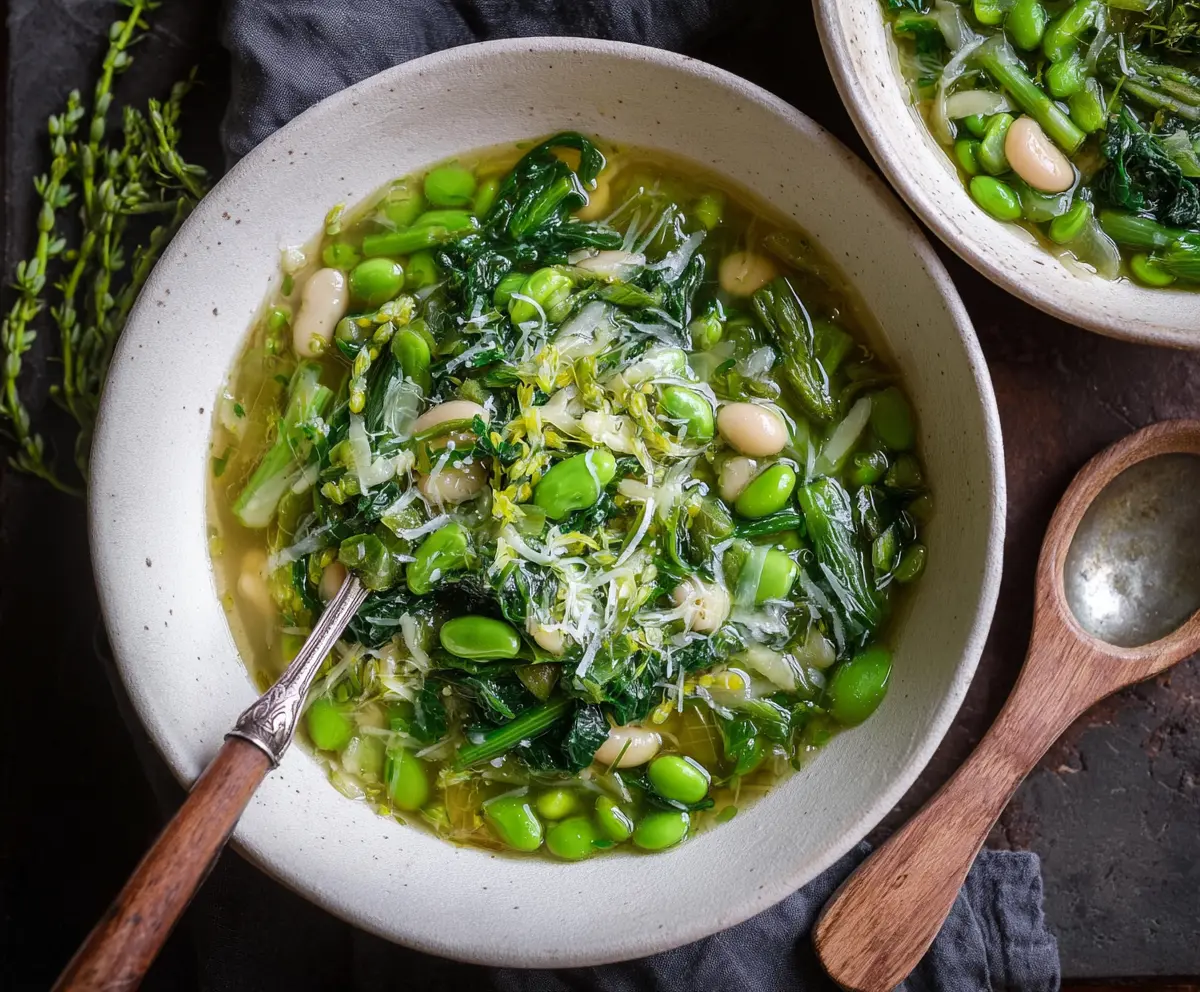 This vibrant spring green minestrone highlights fresh, tender vegetables and beans in a light, flavorful broth perfect for the season.